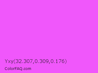 Yxy 32.307,0.309,0.176 Color is a light magenta color and the nearest color is Pink Flamingo Crayola #ff66ff. Hex code #f057fb and RGB value is rgb(240,87,251). In RGB color space, this color is composed of 94% red, 34% green, 98% blue, In CMYK color space, this color is composed of 4% cyan, 65% magenta, 0% yellow , 2% black , In HSL color space, this color has a hue angle of 296° , 95% saturation and 66% lightness.
