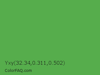 Yxy 32.34,0.311,0.502 Color is a normal green color and the nearest color is Apple #4fa83d. Hex code #56ad4c and RGB value is rgb(86,173,76). In RGB color space, this color is composed of 34% red, 68% green, 30% blue, In CMYK color space, this color is composed of 50% cyan, 0% magenta, 56% yellow , 32% black , In HSL color space, this color has a hue angle of 114° , 39% saturation and 49% lightness.