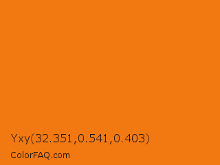 Yxy 32.351,0.541,0.403 Color is a normal orange color and the nearest color is Ecstasy #fa7814. Hex code #f27811 and RGB value is rgb(242,120,17). In RGB color space, this color is composed of 95% red, 47% green, 7% blue, In CMYK color space, this color is composed of 0% cyan, 50% magenta, 93% yellow , 5% black , In HSL color space, this color has a hue angle of 27° , 90% saturation and 51% lightness.