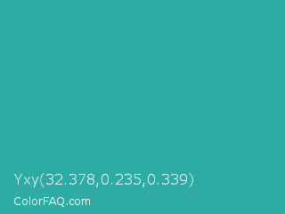 Yxy 32.378,0.235,0.339 Color is a normal cyan color and the nearest color is Keppel #3ab09e. Hex code #2eaba5 and RGB value is rgb(46,171,165). In RGB color space, this color is composed of 18% red, 67% green, 65% blue, In CMYK color space, this color is composed of 73% cyan, 0% magenta, 4% yellow , 33% black , In HSL color space, this color has a hue angle of 177° , 58% saturation and 43% lightness.