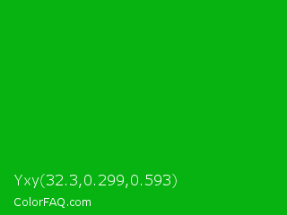 Yxy 32.3,0.299,0.593 Color is a normal green color and the nearest color is Islamic Green #009000. Hex code #06b310 and RGB value is rgb(6,179,16). In RGB color space, this color is composed of 2% red, 70% green, 6% blue, In CMYK color space, this color is composed of 97% cyan, 0% magenta, 91% yellow , 30% black , In HSL color space, this color has a hue angle of 123° , 94% saturation and 36% lightness.