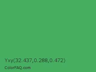 Yxy 32.437,0.288,0.472 Color is a normal green color and the nearest color is Chateau Green #40a860. Hex code #46ae61 and RGB value is rgb(70,174,97). In RGB color space, this color is composed of 27% red, 68% green, 38% blue, In CMYK color space, this color is composed of 60% cyan, 0% magenta, 44% yellow , 32% black , In HSL color space, this color has a hue angle of 136° , 43% saturation and 48% lightness.