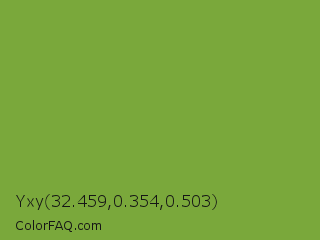 Yxy 32.459,0.354,0.503 Color is a normal green color and the nearest color is Sushi #87ab39. Hex code #7aa83b and RGB value is rgb(122,168,59). In RGB color space, this color is composed of 48% red, 66% green, 23% blue, In CMYK color space, this color is composed of 27% cyan, 0% magenta, 65% yellow , 34% black , In HSL color space, this color has a hue angle of 85° , 48% saturation and 45% lightness.