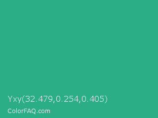 Yxy 32.479,0.254,0.405 Color is a normal green color and the nearest color is Jungle Green #29ab87. Hex code #2bae85 and RGB value is rgb(43,174,133). In RGB color space, this color is composed of 17% red, 68% green, 52% blue, In CMYK color space, this color is composed of 75% cyan, 0% magenta, 24% yellow , 32% black , In HSL color space, this color has a hue angle of 161° , 60% saturation and 43% lightness.