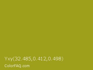 Yxy 32.485,0.412,0.498 Color is a normal yellow color and the nearest color is Citron #9fa91f. Hex code #9ea01b and RGB value is rgb(158,160,27). In RGB color space, this color is composed of 62% red, 63% green, 11% blue, In CMYK color space, this color is composed of 1% cyan, 0% magenta, 83% yellow , 37% black , In HSL color space, this color has a hue angle of 61° , 71% saturation and 37% lightness.