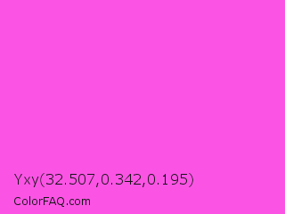 Yxy 32.507,0.342,0.195 Color is a light magenta color and the nearest color is Purple Pizzazz #fe4eda. Hex code #fb54e5 and RGB value is rgb(251,84,229). In RGB color space, this color is composed of 98% red, 33% green, 90% blue, In CMYK color space, this color is composed of 0% cyan, 67% magenta, 9% yellow , 2% black , In HSL color space, this color has a hue angle of 308° , 95% saturation and 66% lightness.
