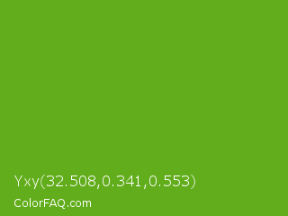 Yxy 32.508,0.341,0.553 Color is a normal green color and the nearest color is Christi #67a712. Hex code #61ad1b and RGB value is rgb(97,173,27). In RGB color space, this color is composed of 38% red, 68% green, 11% blue, In CMYK color space, this color is composed of 44% cyan, 0% magenta, 84% yellow , 32% black , In HSL color space, this color has a hue angle of 91° , 73% saturation and 39% lightness.