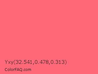 Yxy 32.541,0.478,0.313 Color is a light red color and the nearest color is Begonia #fa6e79. Hex code #ff6879 and RGB value is rgb(255,104,121). In RGB color space, this color is composed of 100% red, 41% green, 47% blue, In CMYK color space, this color is composed of 0% cyan, 59% magenta, 53% yellow , 0% black , In HSL color space, this color has a hue angle of 353° , 100% saturation and 70% lightness.