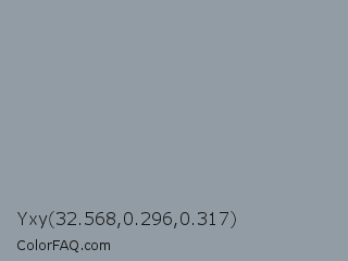 Yxy 32.568,0.296,0.317 Color is a light blue color and the nearest color is Manatee #979aaa. Hex code #929ca4 and RGB value is rgb(146,156,164). In RGB color space, this color is composed of 57% red, 61% green, 64% blue, In CMYK color space, this color is composed of 11% cyan, 5% magenta, 0% yellow , 36% black , In HSL color space, this color has a hue angle of 207° , 9% saturation and 61% lightness.