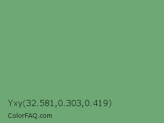 Yxy 32.581,0.303,0.419 Color is a normal green color and the nearest color is Aqua Forest #5fa777. Hex code #6ea874 and RGB value is rgb(110,168,116). In RGB color space, this color is composed of 43% red, 66% green, 45% blue, In CMYK color space, this color is composed of 35% cyan, 0% magenta, 31% yellow , 34% black , In HSL color space, this color has a hue angle of 126° , 25% saturation and 55% lightness.