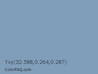 Yxy 32.588,0.264,0.287 Color is a light blue color and the nearest color is Bali Hai #859faf. Hex code #809eba and RGB value is rgb(128,158,186). In RGB color space, this color is composed of 50% red, 62% green, 73% blue, In CMYK color space, this color is composed of 31% cyan, 15% magenta, 0% yellow , 27% black , In HSL color space, this color has a hue angle of 209° , 30% saturation and 62% lightness.
