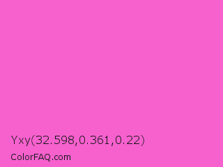 Yxy 32.598,0.361,0.22 Color is a light magenta color and the nearest color is Light Deep Pink #ff5ccd. Hex code #f661ce and RGB value is rgb(246,97,206). In RGB color space, this color is composed of 96% red, 38% green, 81% blue, In CMYK color space, this color is composed of 0% cyan, 61% magenta, 16% yellow , 4% black , In HSL color space, this color has a hue angle of 316° , 89% saturation and 67% lightness.