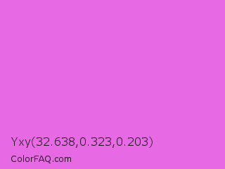 Yxy 32.638,0.323,0.203 Color is a light magenta color and the nearest color is Orchid #da70d6. Hex code #e769e3 and RGB value is rgb(231,105,227). In RGB color space, this color is composed of 91% red, 41% green, 89% blue, In CMYK color space, this color is composed of 0% cyan, 55% magenta, 2% yellow , 9% black , In HSL color space, this color has a hue angle of 302° , 72% saturation and 66% lightness.