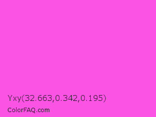 Yxy 32.663,0.342,0.195 Color is a light magenta color and the nearest color is Purple Pizzazz #fe4eda. Hex code #fb54e5 and RGB value is rgb(251,84,229). In RGB color space, this color is composed of 98% red, 33% green, 90% blue, In CMYK color space, this color is composed of 0% cyan, 67% magenta, 9% yellow , 2% black , In HSL color space, this color has a hue angle of 308° , 95% saturation and 66% lightness.
