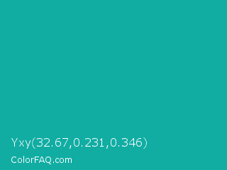 Yxy 32.67,0.231,0.346 Color is a normal cyan color and the nearest color is Light Sea Green #20b2aa. Hex code #11ada3 and RGB value is rgb(17,173,163). In RGB color space, this color is composed of 7% red, 68% green, 64% blue, In CMYK color space, this color is composed of 90% cyan, 0% magenta, 6% yellow , 32% black , In HSL color space, this color has a hue angle of 176° , 82% saturation and 37% lightness.