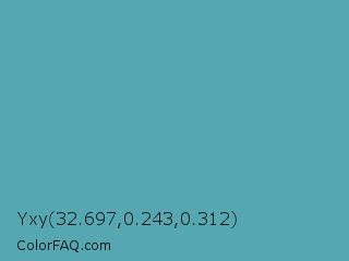Yxy 32.697,0.243,0.312 Color is a normal cyan color and the nearest color is Hippie Blue #589aaf. Hex code #55a7b1 and RGB value is rgb(85,167,177). In RGB color space, this color is composed of 33% red, 65% green, 69% blue, In CMYK color space, this color is composed of 52% cyan, 6% magenta, 0% yellow , 31% black , In HSL color space, this color has a hue angle of 187° , 37% saturation and 51% lightness.