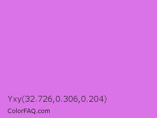 Yxy 32.726,0.306,0.204 Color is a light magenta color and the nearest color is Orchid #da70d6. Hex code #d973e6 and RGB value is rgb(217,115,230). In RGB color space, this color is composed of 85% red, 45% green, 90% blue, In CMYK color space, this color is composed of 6% cyan, 50% magenta, 0% yellow , 10% black , In HSL color space, this color has a hue angle of 293° , 70% saturation and 68% lightness.