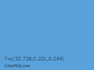 Yxy 32.728,0.221,0.244 Color is a normal blue color and the nearest color is Carolina Blue #56a0d3. Hex code #59a1db and RGB value is rgb(89,161,219). In RGB color space, this color is composed of 35% red, 63% green, 86% blue, In CMYK color space, this color is composed of 59% cyan, 26% magenta, 0% yellow , 14% black , In HSL color space, this color has a hue angle of 207° , 64% saturation and 60% lightness.