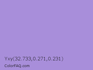 Yxy 32.733,0.271,0.231 Color is a light violet color and the nearest color is East Side #ac91ce. Hex code #a88eda and RGB value is rgb(168,142,218). In RGB color space, this color is composed of 66% red, 56% green, 85% blue, In CMYK color space, this color is composed of 23% cyan, 35% magenta, 0% yellow , 15% black , In HSL color space, this color has a hue angle of 261° , 51% saturation and 71% lightness.