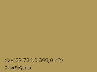 Yxy 32.734,0.399,0.42 Color is a normal orange color and the nearest color is Teak #b19461. Hex code #b09959 and RGB value is rgb(176,153,89). In RGB color space, this color is composed of 69% red, 60% green, 35% blue, In CMYK color space, this color is composed of 0% cyan, 13% magenta, 49% yellow , 31% black , In HSL color space, this color has a hue angle of 44° , 36% saturation and 52% lightness.