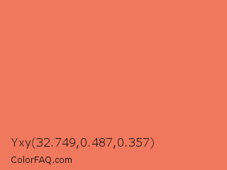 Yxy 32.749,0.487,0.357 Color is a light red color and the nearest color is Burnt Sienna #e97451. Hex code #f0785d and RGB value is rgb(240,120,93). In RGB color space, this color is composed of 94% red, 47% green, 36% blue, In CMYK color space, this color is composed of 0% cyan, 50% magenta, 61% yellow , 6% black , In HSL color space, this color has a hue angle of 11° , 83% saturation and 65% lightness.