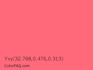 Yxy 32.768,0.476,0.313 Color is a light red color and the nearest color is Begonia #fa6e79. Hex code #ff697a and RGB value is rgb(255,105,122). In RGB color space, this color is composed of 100% red, 41% green, 48% blue, In CMYK color space, this color is composed of 0% cyan, 59% magenta, 52% yellow , 0% black , In HSL color space, this color has a hue angle of 353° , 100% saturation and 71% lightness.