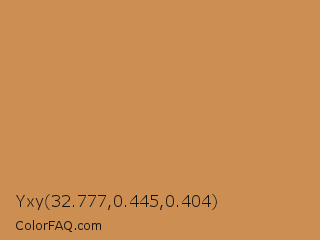 Yxy 32.777,0.445,0.404 Color is a normal orange color and the nearest color is Raw Sienna #d68a59. Hex code #cc8e51 and RGB value is rgb(204,142,81). In RGB color space, this color is composed of 80% red, 56% green, 32% blue, In CMYK color space, this color is composed of 0% cyan, 30% magenta, 60% yellow , 20% black , In HSL color space, this color has a hue angle of 30° , 55% saturation and 56% lightness.