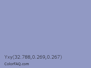 Yxy 32.788,0.269,0.267 Color is a light blue color and the nearest color is Blue Bell Crayola #9999cc. Hex code #9199c4 and RGB value is rgb(145,153,196). In RGB color space, this color is composed of 57% red, 60% green, 77% blue, In CMYK color space, this color is composed of 26% cyan, 22% magenta, 0% yellow , 23% black , In HSL color space, this color has a hue angle of 231° , 30% saturation and 67% lightness.