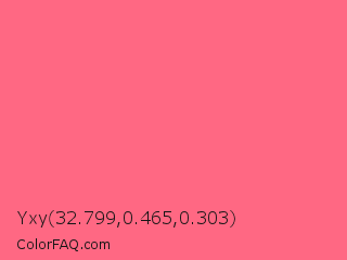 Yxy 32.799,0.465,0.303 Color is a light red color and the nearest color is Ultra Red #fc6c85. Hex code #ff6883 and RGB value is rgb(255,104,131). In RGB color space, this color is composed of 100% red, 41% green, 51% blue, In CMYK color space, this color is composed of 0% cyan, 59% magenta, 49% yellow , 0% black , In HSL color space, this color has a hue angle of 349° , 100% saturation and 70% lightness.