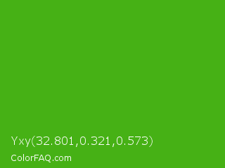 Yxy 32.801,0.321,0.573 Color is a normal green color and the nearest color is Kelly Green #4cbb17. Hex code #46b115 and RGB value is rgb(70,177,21). In RGB color space, this color is composed of 27% red, 69% green, 8% blue, In CMYK color space, this color is composed of 60% cyan, 0% magenta, 88% yellow , 31% black , In HSL color space, this color has a hue angle of 101° , 79% saturation and 39% lightness.