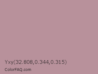 Yxy 32.808,0.344,0.315 Color is a light red color and the nearest color is Tuscany #c09999. Hex code #b8919b and RGB value is rgb(184,145,155). In RGB color space, this color is composed of 72% red, 57% green, 61% blue, In CMYK color space, this color is composed of 0% cyan, 21% magenta, 16% yellow , 28% black , In HSL color space, this color has a hue angle of 345° , 22% saturation and 65% lightness.
