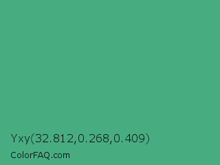 Yxy 32.812,0.268,0.409 Color is a normal green color and the nearest color is Ocean Green #41aa78. Hex code #47ad81 and RGB value is rgb(71,173,129). In RGB color space, this color is composed of 28% red, 68% green, 51% blue, In CMYK color space, this color is composed of 59% cyan, 0% magenta, 25% yellow , 32% black , In HSL color space, this color has a hue angle of 154° , 42% saturation and 48% lightness.