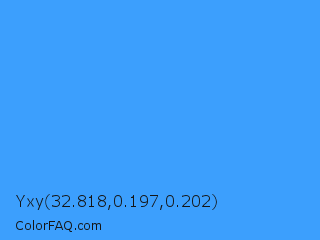 Yxy 32.818,0.197,0.202 Color is a light blue color and the nearest color is Brilliant Azure #3399ff. Hex code #3c9ffd and RGB value is rgb(60,159,253). In RGB color space, this color is composed of 24% red, 62% green, 99% blue, In CMYK color space, this color is composed of 76% cyan, 37% magenta, 0% yellow , 1% black , In HSL color space, this color has a hue angle of 209° , 98% saturation and 61% lightness.