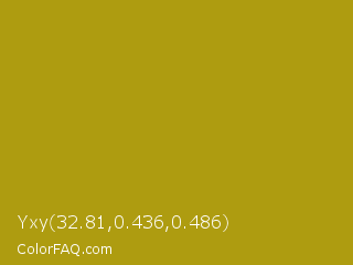 Yxy 32.81,0.436,0.486 Color is a normal yellow color and the nearest color is Sahara #b7a214. Hex code #ae9c10 and RGB value is rgb(174,156,16). In RGB color space, this color is composed of 68% red, 61% green, 6% blue, In CMYK color space, this color is composed of 0% cyan, 10% magenta, 91% yellow , 32% black , In HSL color space, this color has a hue angle of 53° , 83% saturation and 37% lightness.