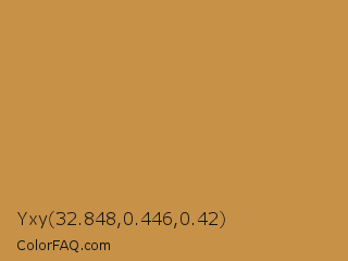 Yxy 32.848,0.446,0.42 Color is a normal orange color and the nearest color is Tussock #c5994b. Hex code #c79147 and RGB value is rgb(199,145,71). In RGB color space, this color is composed of 78% red, 57% green, 28% blue, In CMYK color space, this color is composed of 0% cyan, 27% magenta, 64% yellow , 22% black , In HSL color space, this color has a hue angle of 35° , 53% saturation and 53% lightness.