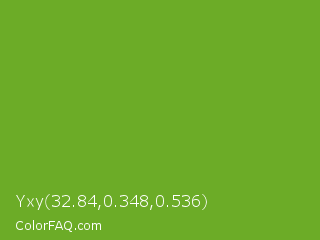 Yxy 32.84,0.348,0.536 Color is a normal green color and the nearest color is Green RYB #66b032. Hex code #6cac27 and RGB value is rgb(108,172,39). In RGB color space, this color is composed of 42% red, 67% green, 15% blue, In CMYK color space, this color is composed of 37% cyan, 0% magenta, 77% yellow , 33% black , In HSL color space, this color has a hue angle of 89° , 63% saturation and 41% lightness.