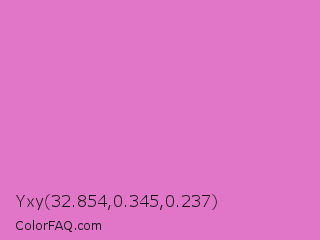 Yxy 32.854,0.345,0.237 Color is a light magenta color and the nearest color is Orchid #da70d6. Hex code #e175c7 and RGB value is rgb(225,117,199). In RGB color space, this color is composed of 88% red, 46% green, 78% blue, In CMYK color space, this color is composed of 0% cyan, 48% magenta, 12% yellow , 12% black , In HSL color space, this color has a hue angle of 314° , 64% saturation and 67% lightness.