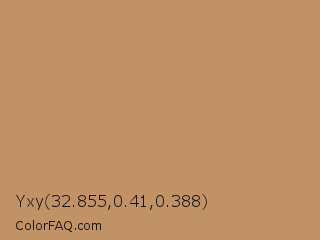 Yxy 32.855,0.41,0.388 Color is a normal orange color and the nearest color is Desert Camel #c19a6b. Hex code #c19266 and RGB value is rgb(193,146,102). In RGB color space, this color is composed of 76% red, 57% green, 40% blue, In CMYK color space, this color is composed of 0% cyan, 24% magenta, 47% yellow , 24% black , In HSL color space, this color has a hue angle of 29° , 42% saturation and 58% lightness.