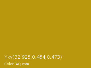 Yxy 32.925,0.454,0.473 Color is a normal yellow color and the nearest color is Sahara #b7a214. Hex code #ba980d and RGB value is rgb(186,152,13). In RGB color space, this color is composed of 73% red, 60% green, 5% blue, In CMYK color space, this color is composed of 0% cyan, 18% magenta, 93% yellow , 27% black , In HSL color space, this color has a hue angle of 48° , 87% saturation and 39% lightness.