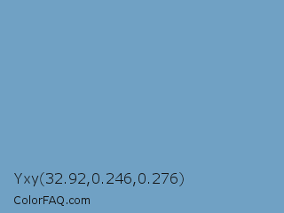 Yxy 32.92,0.246,0.276 Color is a normal blue color and the nearest color is Air Superiority Blue #72a0c1. Hex code #70a1c4 and RGB value is rgb(112,161,196). In RGB color space, this color is composed of 44% red, 63% green, 77% blue, In CMYK color space, this color is composed of 43% cyan, 18% magenta, 0% yellow , 23% black , In HSL color space, this color has a hue angle of 205° , 42% saturation and 60% lightness.