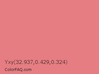 Yxy 32.937,0.429,0.324 Color is a light red color and the nearest color is Light Coral #f08080. Hex code #e57d82 and RGB value is rgb(229,125,130). In RGB color space, this color is composed of 90% red, 49% green, 51% blue, In CMYK color space, this color is composed of 0% cyan, 45% magenta, 43% yellow , 10% black , In HSL color space, this color has a hue angle of 357° , 67% saturation and 69% lightness.