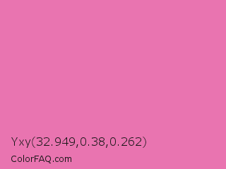 Yxy 32.949,0.38,0.262 Color is a light rose color and the nearest color is Thulian Pink #de6fa1. Hex code #e974b0 and RGB value is rgb(233,116,176). In RGB color space, this color is composed of 91% red, 45% green, 69% blue, In CMYK color space, this color is composed of 0% cyan, 50% magenta, 24% yellow , 9% black , In HSL color space, this color has a hue angle of 329° , 73% saturation and 68% lightness.