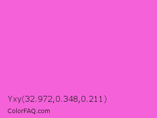 Yxy 32.972,0.348,0.211 Color is a light magenta color and the nearest color is Light Deep Pink #ff5ccd. Hex code #f561d9 and RGB value is rgb(245,97,217). In RGB color space, this color is composed of 96% red, 38% green, 85% blue, In CMYK color space, this color is composed of 0% cyan, 60% magenta, 11% yellow , 4% black , In HSL color space, this color has a hue angle of 311° , 88% saturation and 67% lightness.