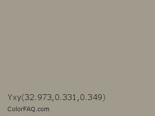 Yxy 32.973,0.331,0.349 Color is a normal orange color and the nearest color is Zorba #a59b91. Hex code #a19b8e and RGB value is rgb(161,155,142). In RGB color space, this color is composed of 63% red, 61% green, 56% blue, In CMYK color space, this color is composed of 0% cyan, 4% magenta, 12% yellow , 37% black , In HSL color space, this color has a hue angle of 41° , 9% saturation and 59% lightness.