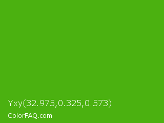 Yxy 32.975,0.325,0.573 Color is a normal green color and the nearest color is Kelly Green #4cbb17. Hex code #4bb110 and RGB value is rgb(75,177,16). In RGB color space, this color is composed of 29% red, 69% green, 6% blue, In CMYK color space, this color is composed of 58% cyan, 0% magenta, 91% yellow , 31% black , In HSL color space, this color has a hue angle of 98° , 83% saturation and 38% lightness.