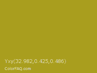 Yxy 32.982,0.425,0.486 Color is a normal yellow color and the nearest color is Lemon Ginger #ac9e22. Hex code #a99e1d and RGB value is rgb(169,158,29). In RGB color space, this color is composed of 66% red, 62% green, 11% blue, In CMYK color space, this color is composed of 0% cyan, 7% magenta, 83% yellow , 34% black , In HSL color space, this color has a hue angle of 55° , 71% saturation and 39% lightness.