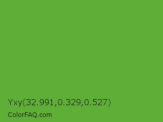 Yxy 32.991,0.329,0.527 Color is a normal green color and the nearest color is Green RYB #66b032. Hex code #5fae38 and RGB value is rgb(95,174,56). In RGB color space, this color is composed of 37% red, 68% green, 22% blue, In CMYK color space, this color is composed of 45% cyan, 0% magenta, 68% yellow , 32% black , In HSL color space, this color has a hue angle of 100° , 51% saturation and 45% lightness.