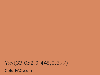 Yxy 33.052,0.448,0.377 Color is a light orange color and the nearest color is Raw Sienna #d68a59. Hex code #d88860 and RGB value is rgb(216,136,96). In RGB color space, this color is composed of 85% red, 53% green, 38% blue, In CMYK color space, this color is composed of 0% cyan, 37% magenta, 56% yellow , 15% black , In HSL color space, this color has a hue angle of 20° , 61% saturation and 61% lightness.