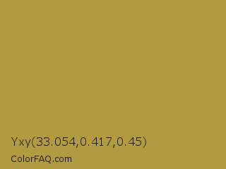 Yxy 33.054,0.417,0.45 Color is a normal yellow color and the nearest color is Brass #b5a642. Hex code #b09b41 and RGB value is rgb(176,155,65). In RGB color space, this color is composed of 69% red, 61% green, 25% blue, In CMYK color space, this color is composed of 0% cyan, 12% magenta, 63% yellow , 31% black , In HSL color space, this color has a hue angle of 49° , 46% saturation and 47% lightness.