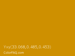 Yxy 33.068,0.485,0.453 Color is a normal orange color and the nearest color is Vivid Amber #cc9900. Hex code #ce9000 and RGB value is rgb(206,144,0). In RGB color space, this color is composed of 81% red, 56% green, 0% blue, In CMYK color space, this color is composed of 0% cyan, 30% magenta, 100% yellow , 19% black , In HSL color space, this color has a hue angle of 42° , 100% saturation and 40% lightness.